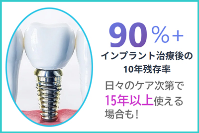 インプラント治療後の10年残存率は90%以上という報告が多く、平均的な寿命は10年〜15年といわれています。これは一般的な目安であり、日々のケア次第で15年以上使える場合もあります。